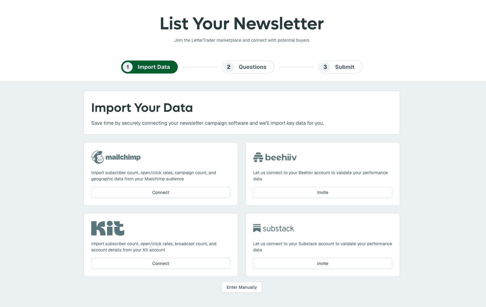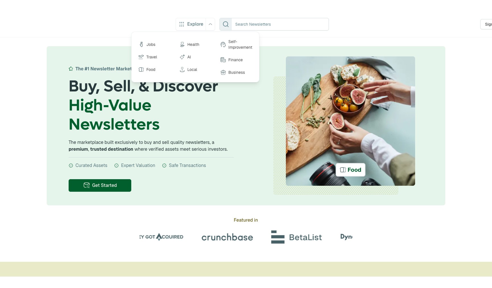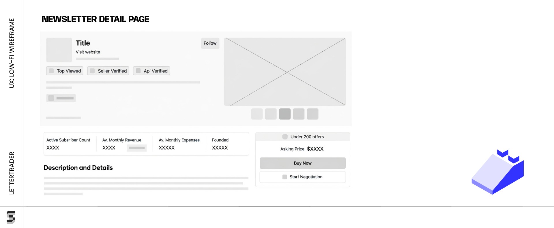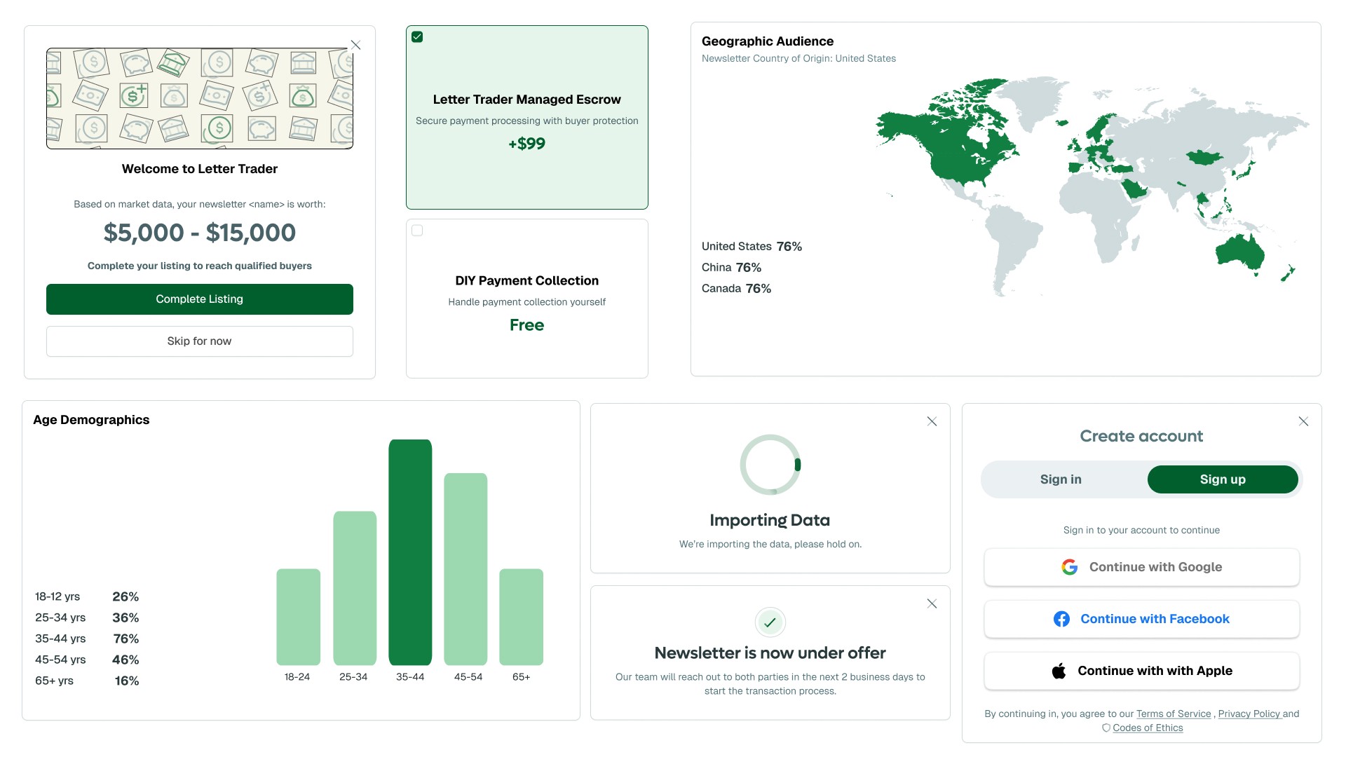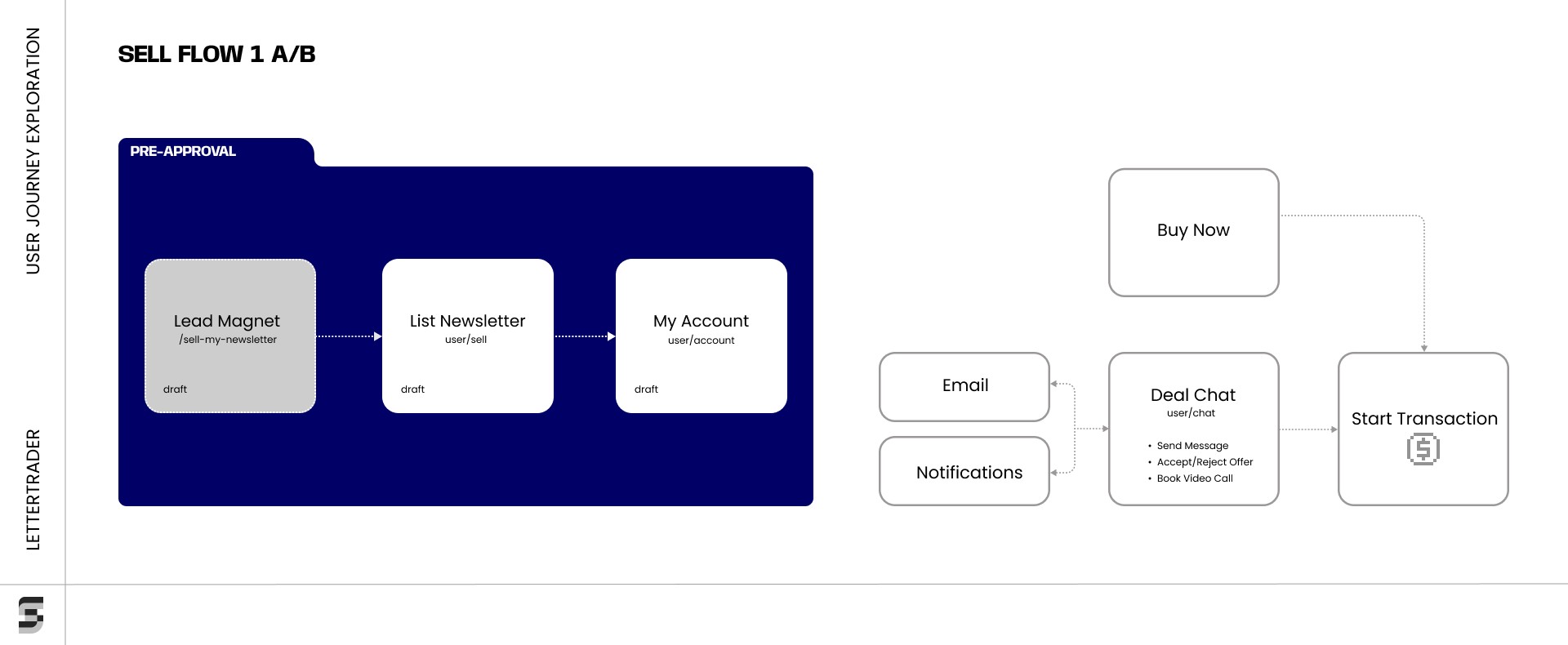 Rather than patching individual problems, we took a holistic approach that addressed LetterTrader's challenges at every level. This began with a complete rebrand including the brand name itself to better reflect the professional, entrepreneurial audience the platform serves. On the product side, we redesigned architecture around trust and safety, implementing new authentication methods, user verification systems, and countermeasures against platform abuse. We restructured user flows for both buyers and sellers, introduced lead magnets for newsletter evaluation, and simplified onboarding while building robust data collection into every step. The goal was a platform that could scale intelligently, not just survive.
