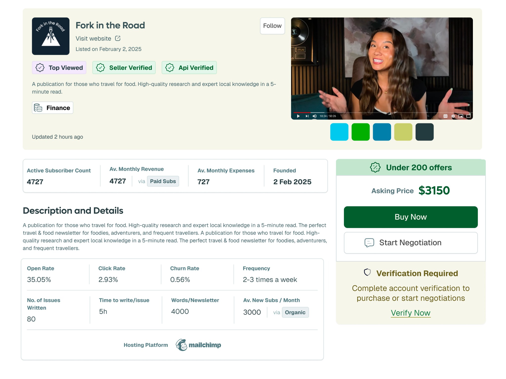 The relaunched platform delivers on every front identified in discovery. Identity verification is now integrated directly, and transactions now include in platform payment coordination by reducing friction for buyers and sellers alike. Custom CRM integrations and business analytics provide leadership with real-time visibility into platform activity and long-term trend analysis, all without adding headcount or specialized resources. New acquisition flows capture leads earlier in the funnel, and a streamlined listing process makes it easier than ever for newsletter operators to get valuations and bring properties to market. The result is a platform positioned for the next several years of growth.