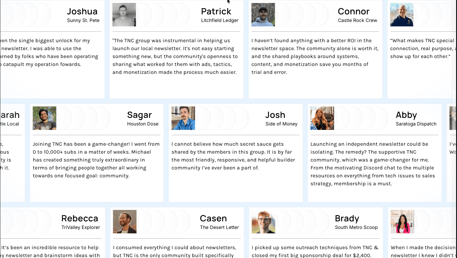 Newsletter Club had grown to hundreds of subscribers over the course of 12 months, evolving into a thriving community built around education, shared playbooks, and a supportive cohort of local media operators. However, the website's front page had simply outgrown the temporary landing page it launched with. It failed to properly hierarchy information, offer clear calls to action, or display the full range of benefits available to members. Most critically, the page lacked the social proof and clarity needed to engage top-of-funnel visitors. Those who were just discovering the community and needed to quickly understand how they could get involved and what value they would receive.